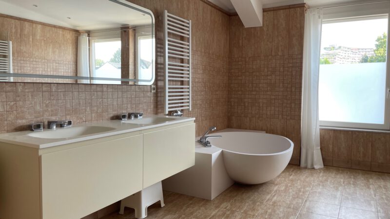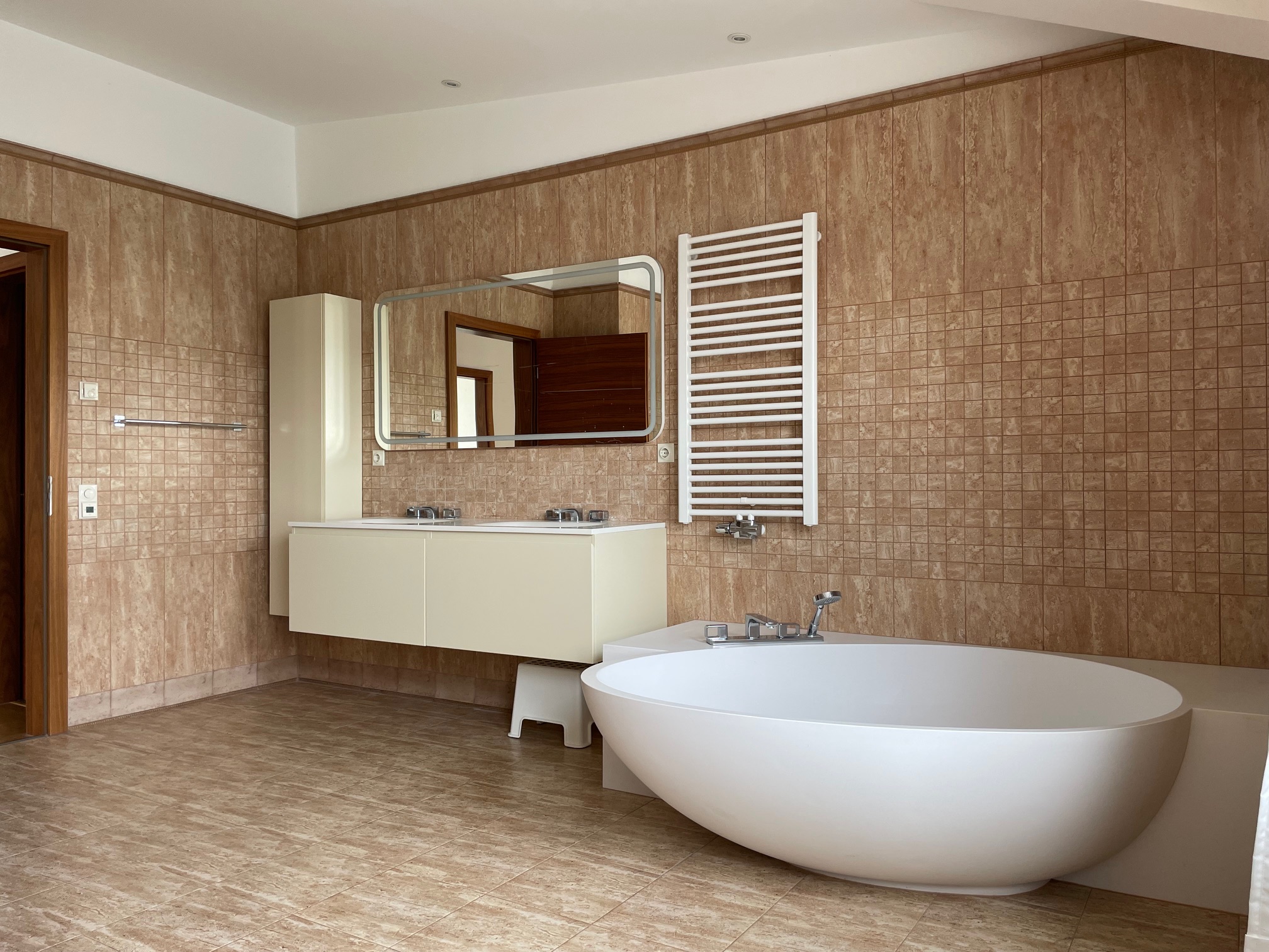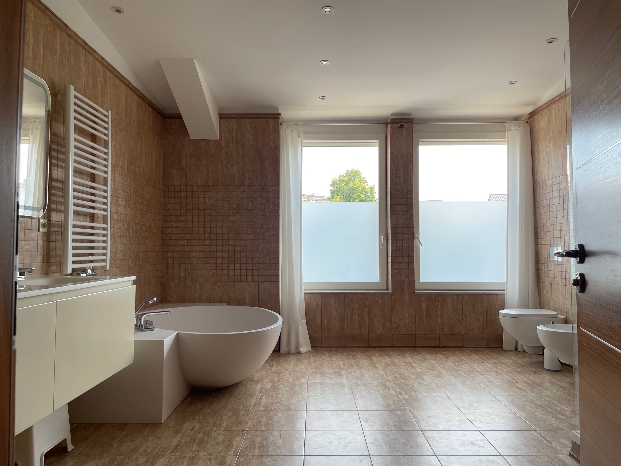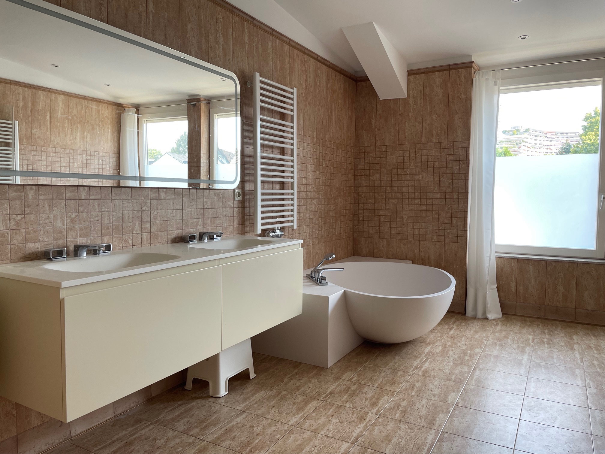 Das großzügige Tageslichtbad beeindruckt mit Wellness-Charakter: begehbare Dusche, moderne Badewanne, Doppelwaschbecken, Bidet und Handtuchheizung lassen keine Wünsche offen.