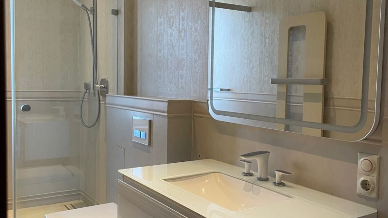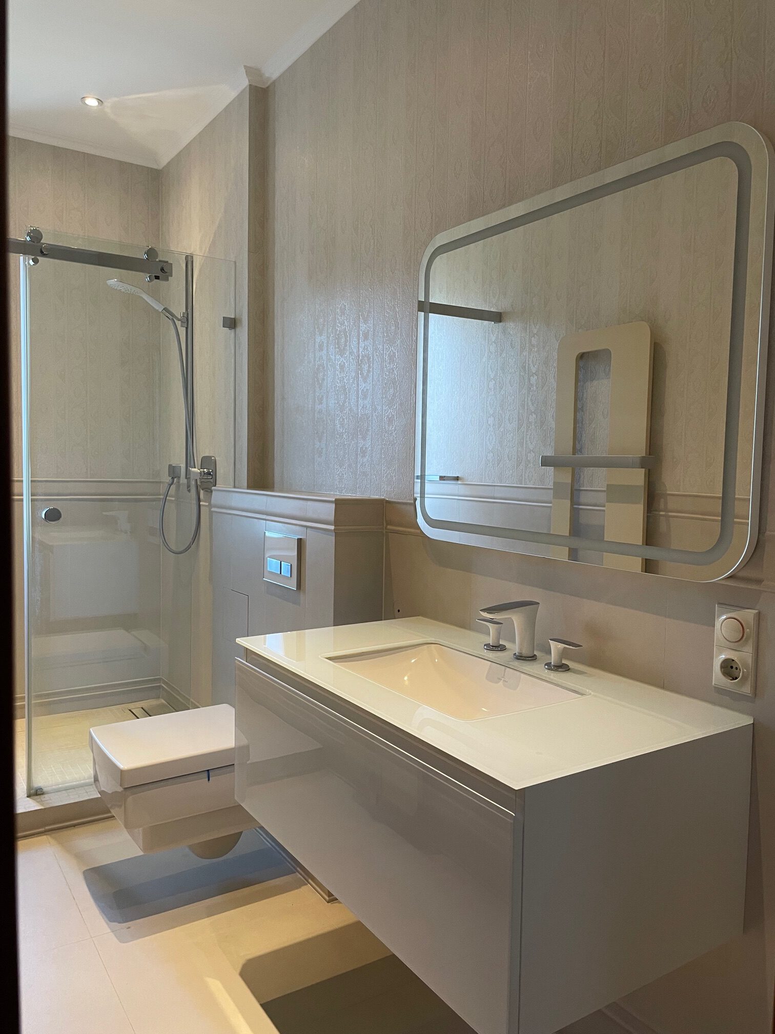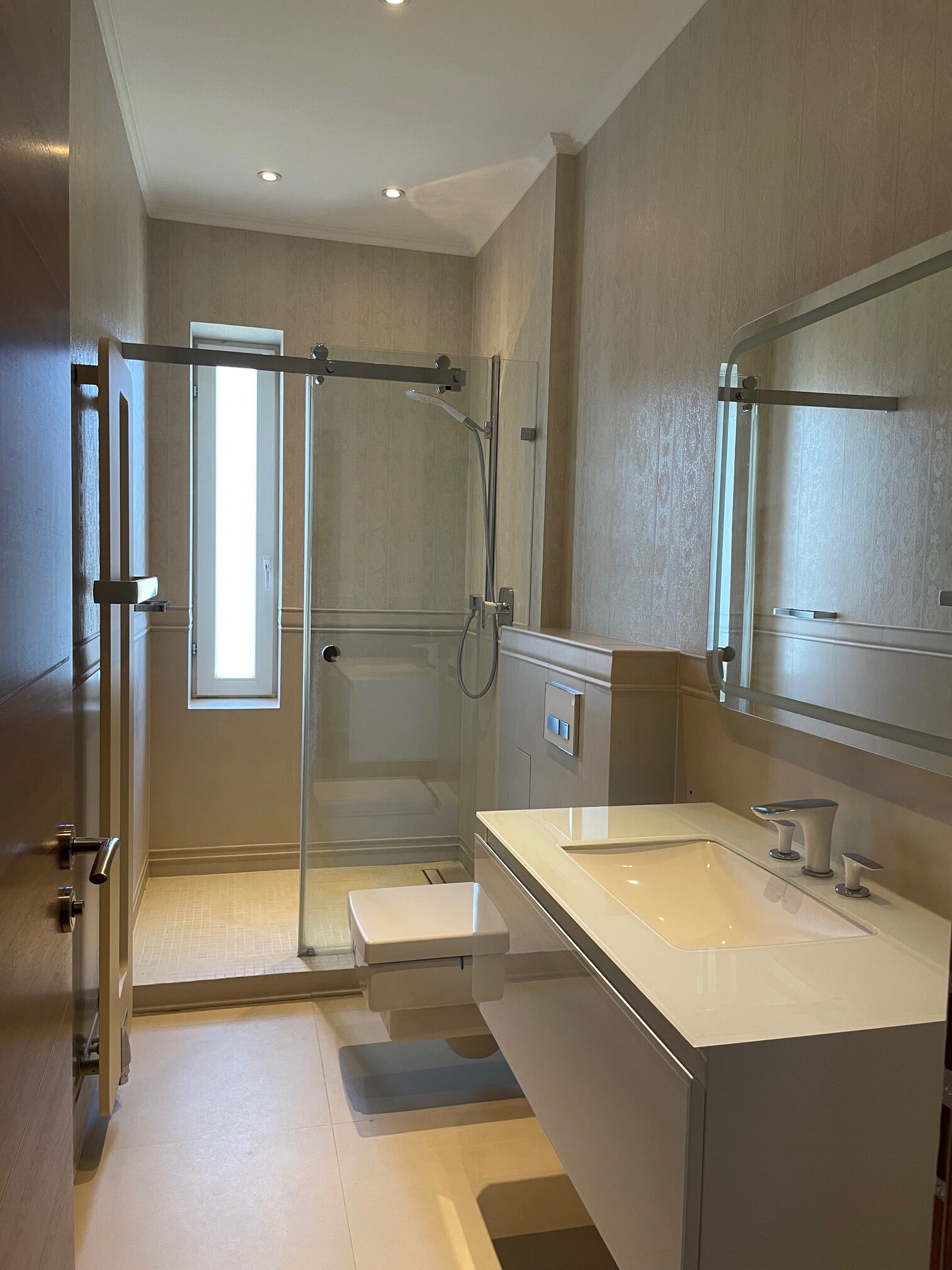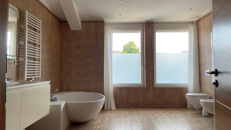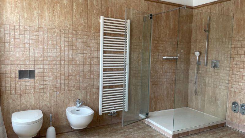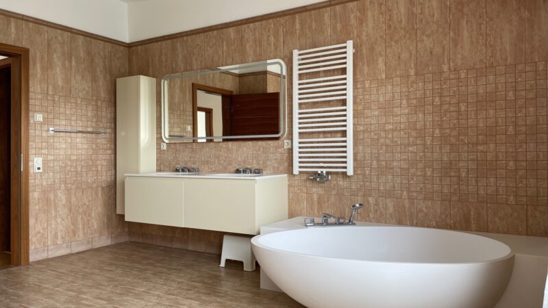 Das großzügige Tageslichtbad beeindruckt mit Wellness-Charakter: begehbare Dusche, moderne Badewanne, Doppelwaschbecken, Bidet und Handtuchheizung lassen keine Wünsche offen.