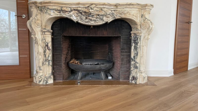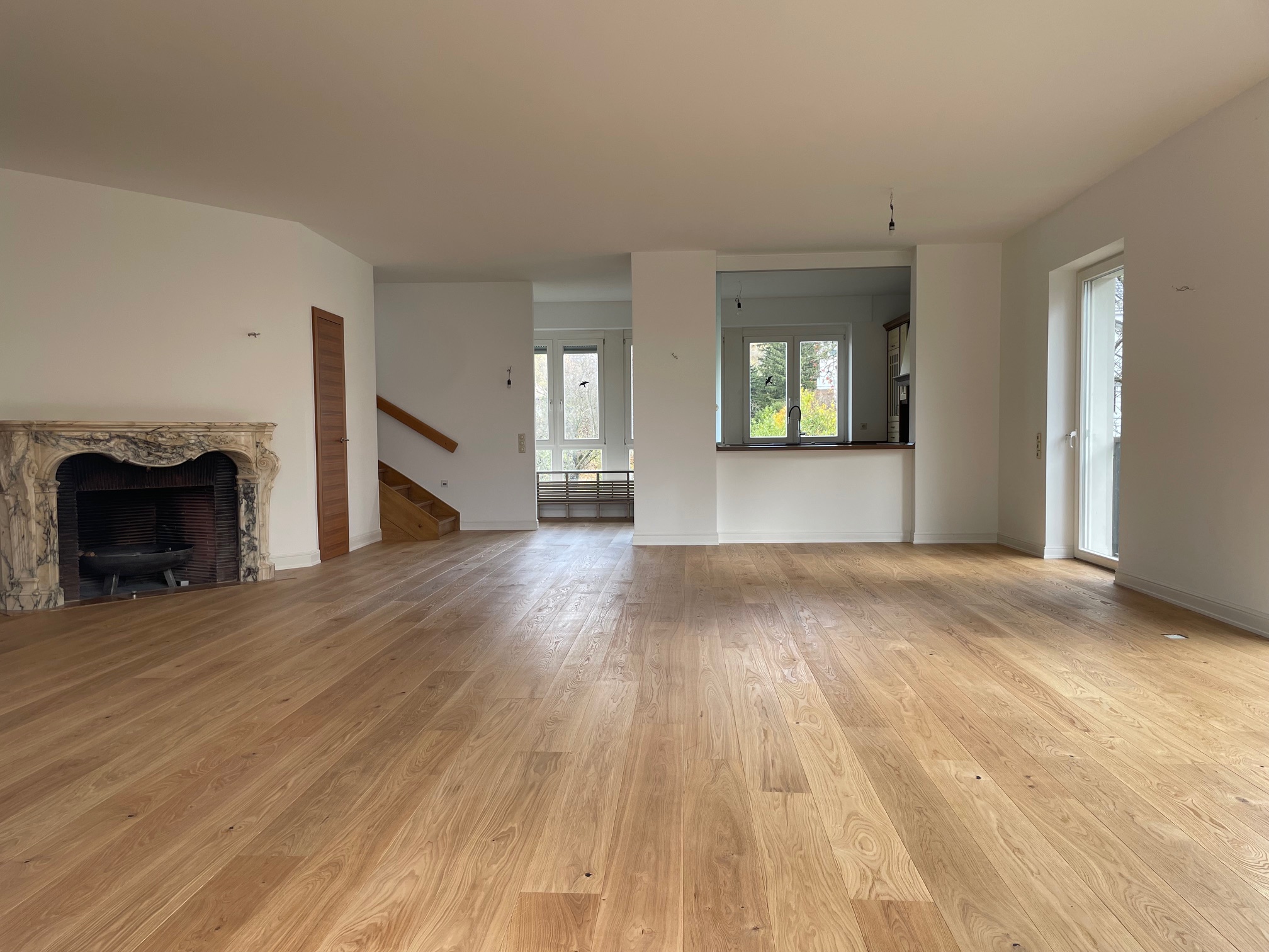 Der Dielenbereich wird durch elegante Flügeltüren vom Wohn- und Essbereich abgegrenzt, was eine stilvolle Verbindung von Offenheit und Privatsphäre schafft.