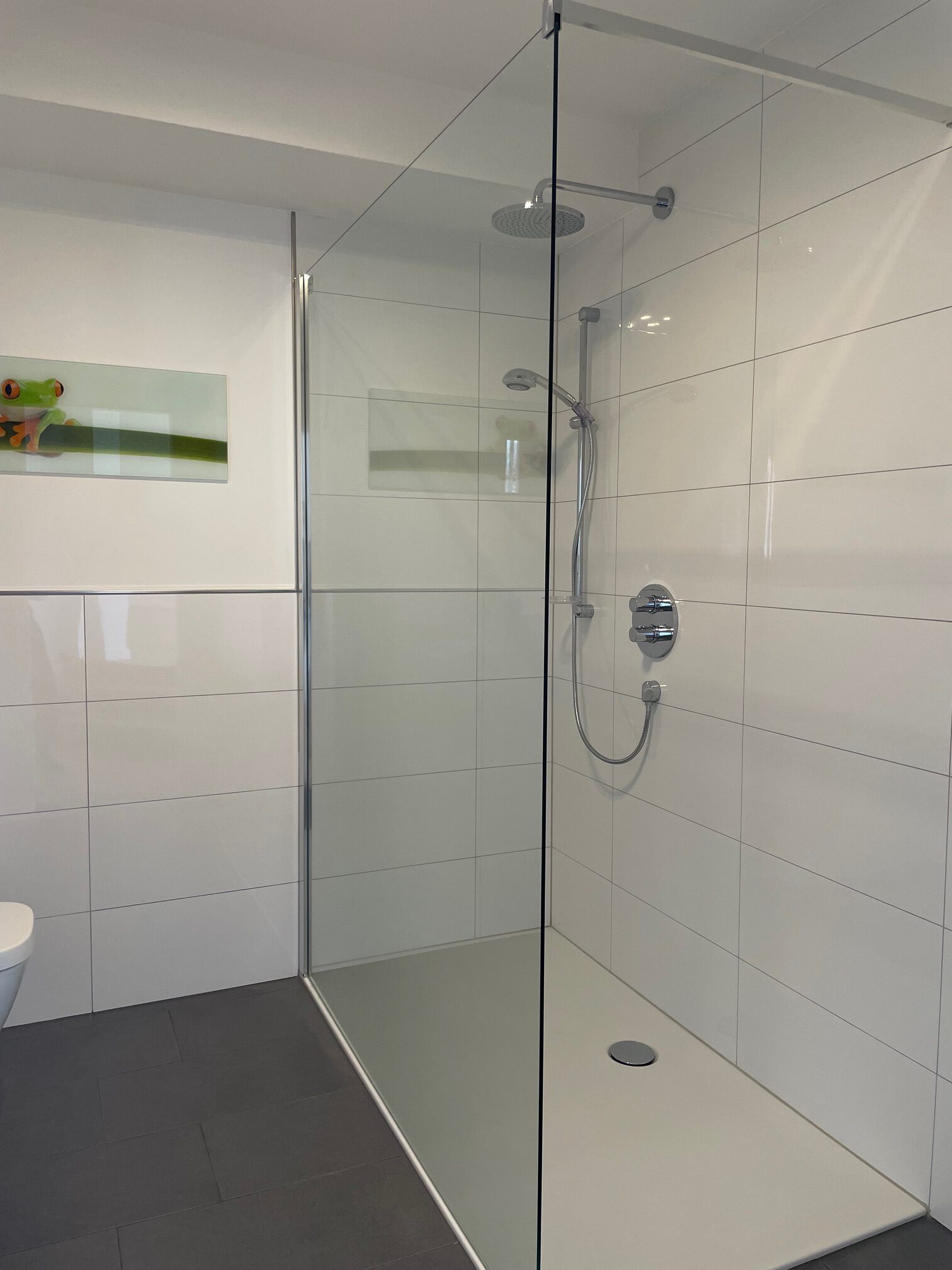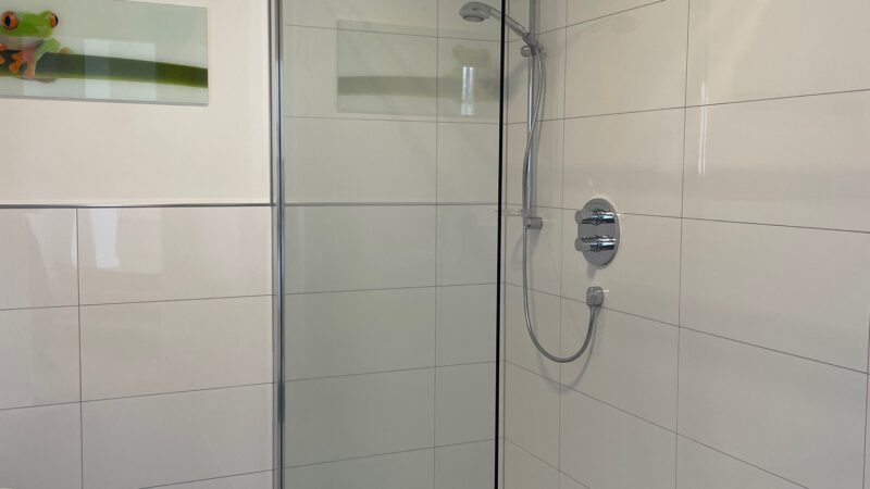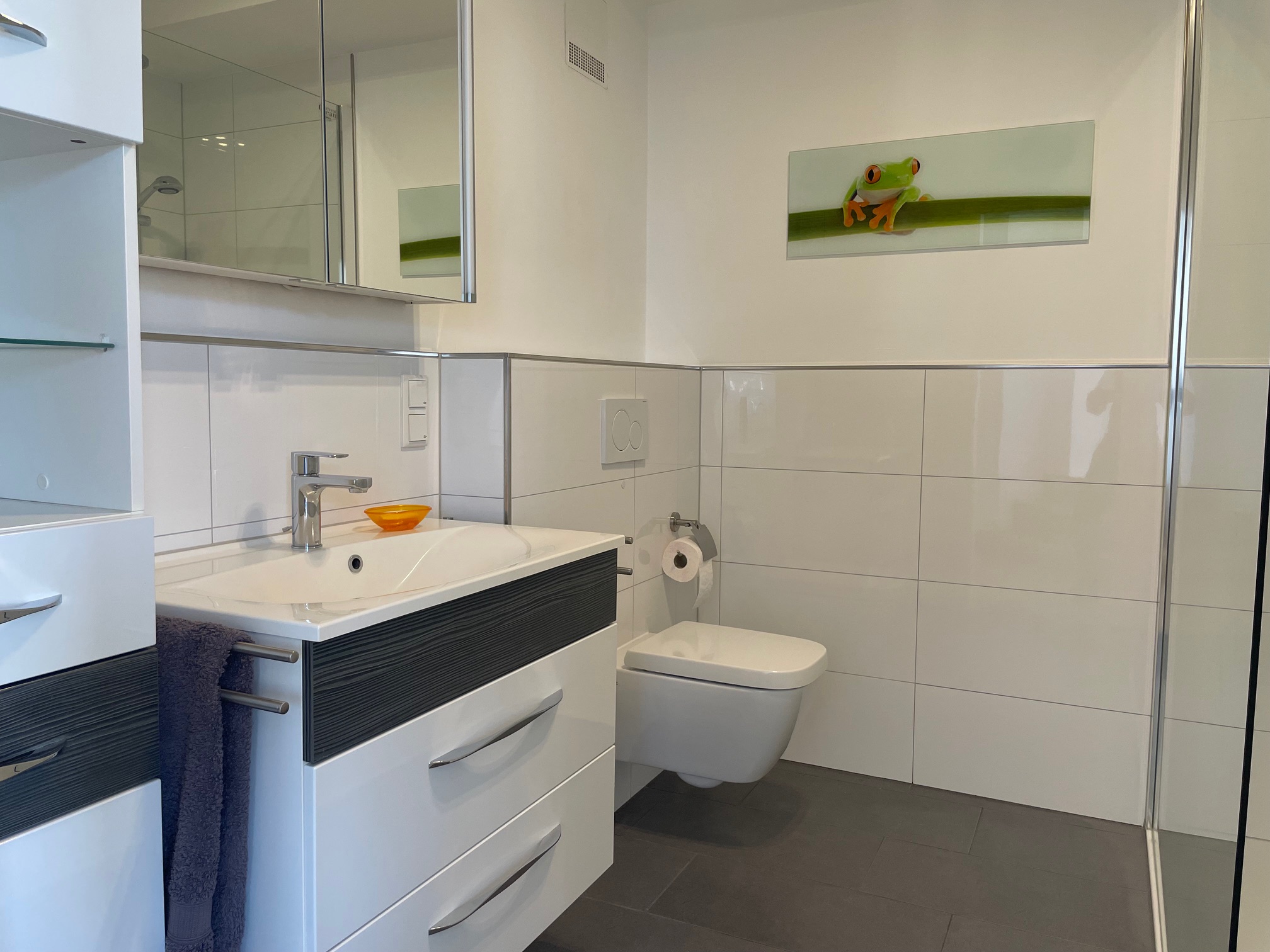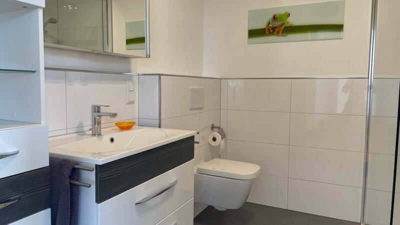 Bereits beim Betreten der Wohnung spürt man die durchdachte Raumaufteilung: Der großzügige Eingangsbereich wird durch wenige Stufen stilvoll vom offenen Wohnbereich getrennt und schafft so eine angenehme architektonische Struktur. Von hier aus erschließen sich das moderne Gäste-WC sowie das hochwertig ausgestattete Duschbad mit ebenerdiger Dusche und stilvoller Glastrennwand. Auch die beiden Schlafzimmer befinden sich auf dieser Ebene und bieten vielseitige Nutzungsmöglichkeiten – ob als Rückzugsort, Kinderzimmer oder Homeoffice.