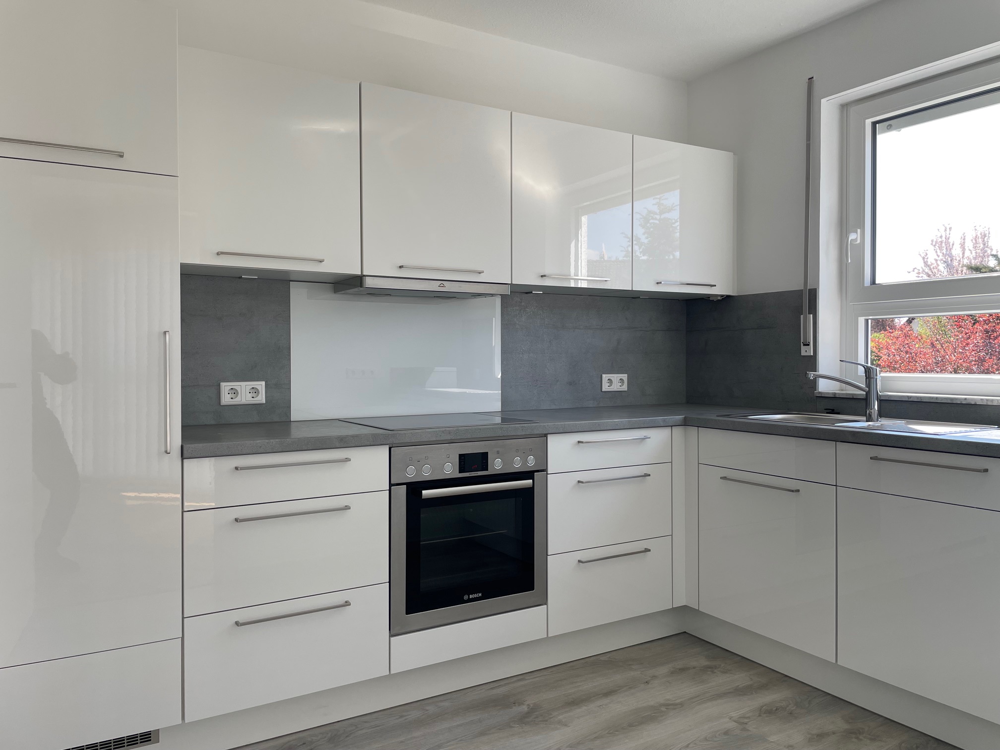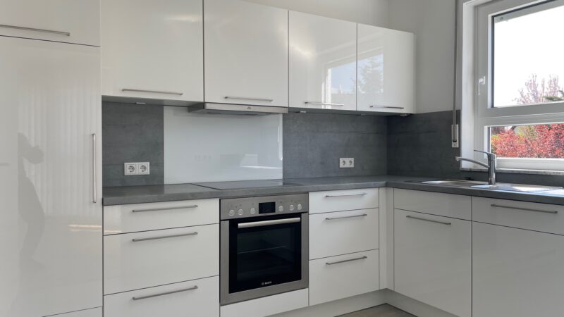 Die angrenzende Küche präsentiert sich modern und funktional, mit ausreichend Platz und direktem Zugang zu einem praktischen Abstell- bzw. Vorratsraum inklusive Waschmaschinenanschluss.
